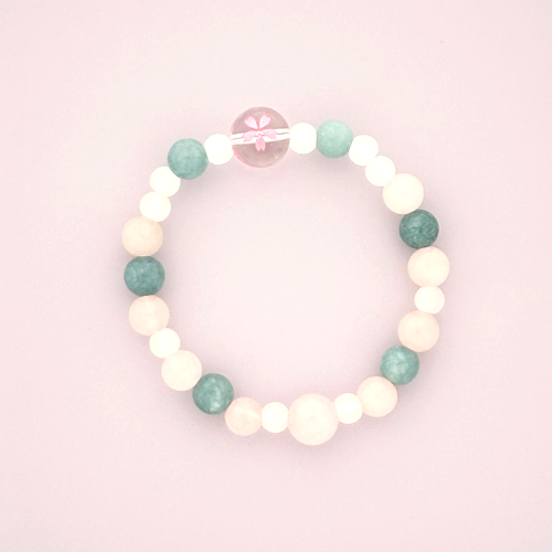 優しく穏やかな愛の波動を持つ桜水晶、愛と美の象徴ともいえるローズクォーツ、優しさと思いやりを育てる癒しの石アクアマリン・白い母性と言われるホワイトアゲートを組み合わせたブレスレットです。